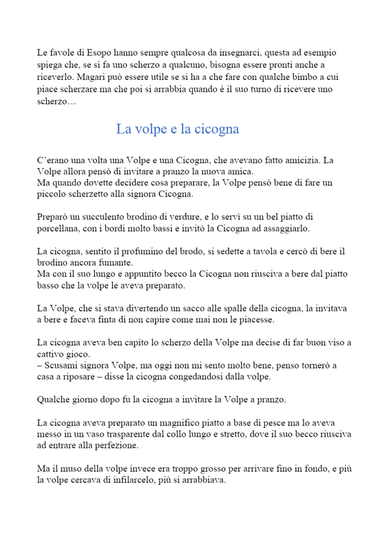Ciao bambini! Eccoci di nuovo insieme. Oggi ho preparato un bellissimo percorso di un racconto di Esopo: "La volpe e la cicogna". Questo famoso scrittore, ha composto tanti racconti che insegnano sempre tante cose belle e importanti. Le sue storie alla fine hanno sempre una morale che ci spiega quale sarebbe il comportamento da poter mettere in pratica. Non mi resta che augurarvi buon lavoro!