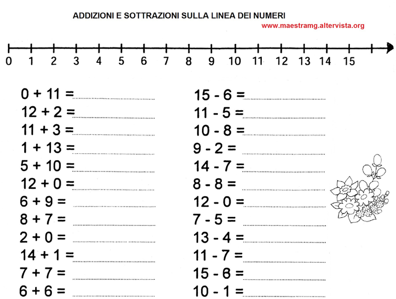 Completate la scheda stampandola o ricopiandola sul quaderno. Senza scrivere sulla linea dei numeri, fate la sottrazione partendo dal numero indicato dall'operazione e andando indietro con il vostro ditino secondo il numero che dovete togliere. Fate questo procedimento per tutte le operazioni proposte 